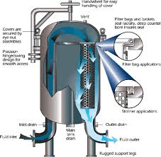 Cách vận hành thiết bị lọc nhiều túi (Housing lọc nhiều túi): Chất lỏng bơm vào trong sau đó đi xuyên qua túi lọc ra ngoài theo đường xả bên dưới, cặn được giữ lại trong lòng túi lọc, túi bị nghẹt khi mà chênh lệch áp giữa vào và ra 2bar, lúc này lưu lượng bắt đầu giảm nhiều.